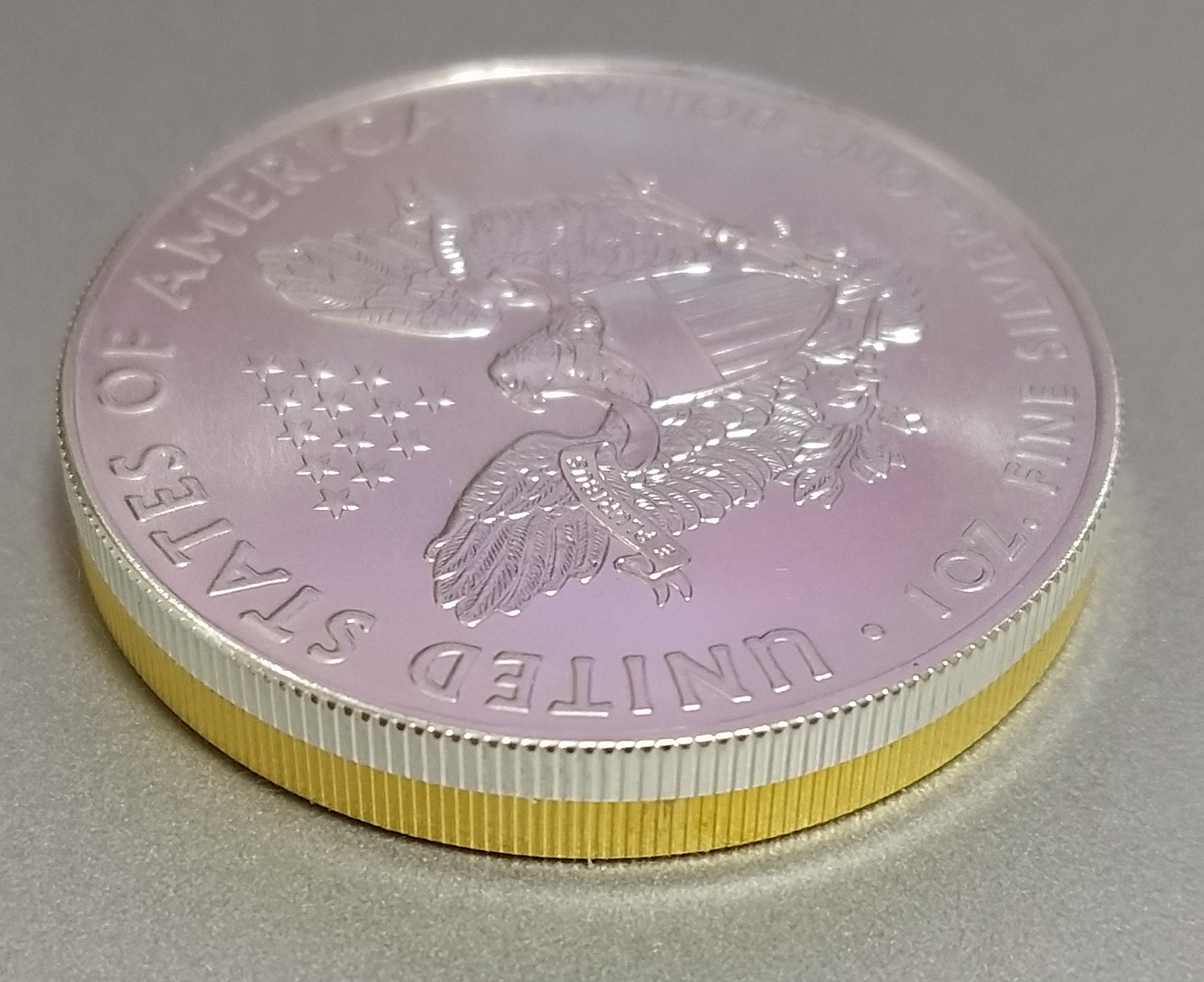 Particolari della rigatura del bordo ed a confronto di spessore con una moneta in oro australiana da 2 once.