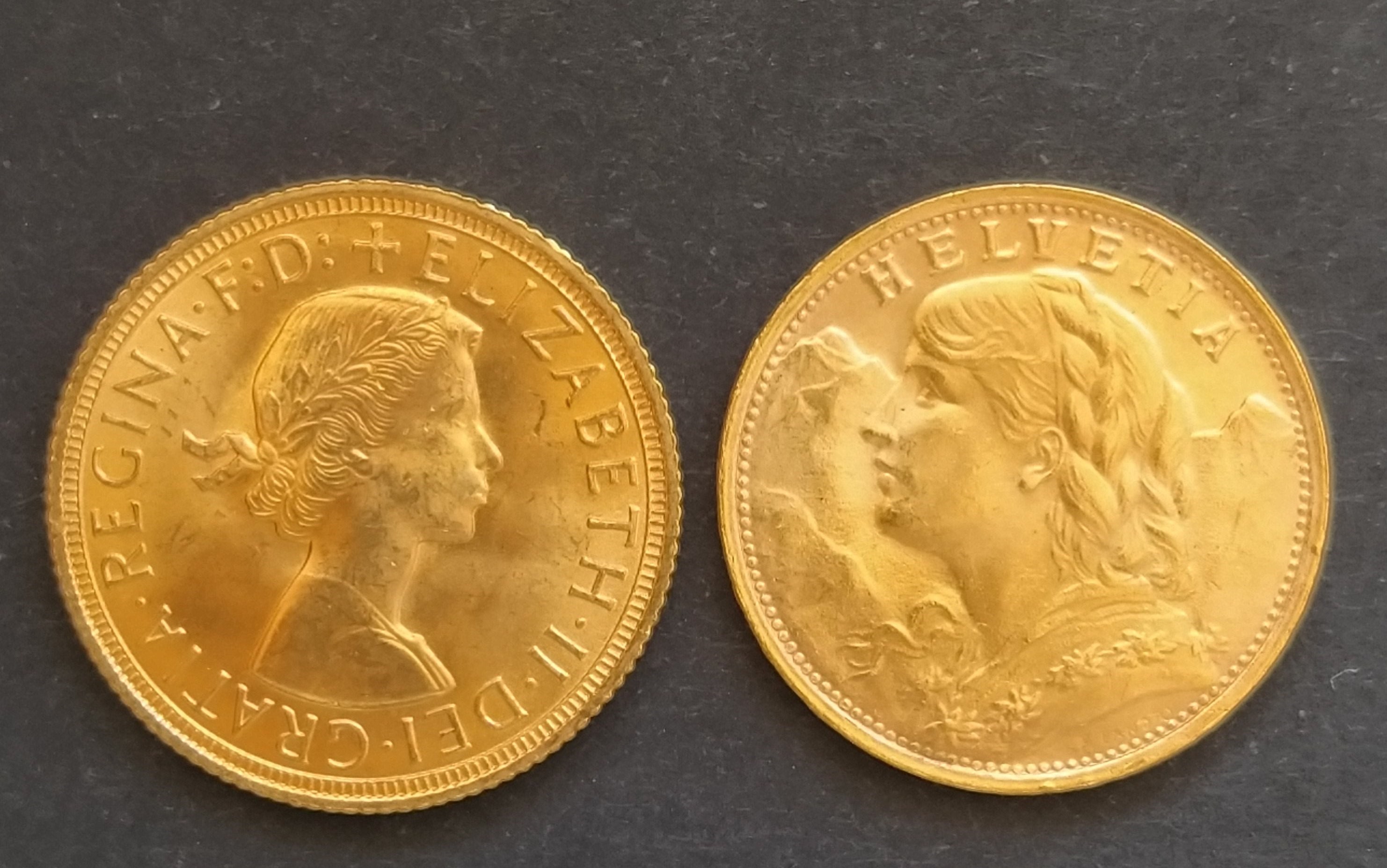 Confronto tra una sterlina d’oro inglese ed un 20 franchi svizzero.