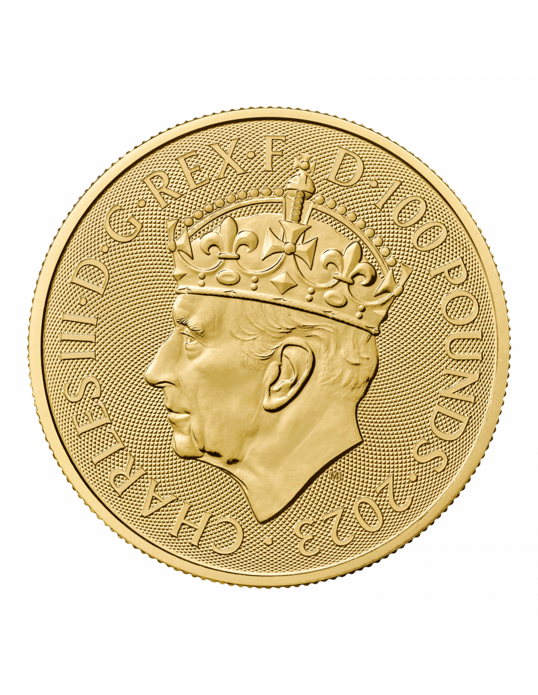 Il disegno sul rovescio della moneta mostra lo stemma reale con le iniziali di Sua Maestà il Re. Ogni moneta della gamma reca anche il primo ritratto incoronato di Sua Maestà il Re, disegnato da Martin Jennings. Questa versione d'oro da 1 oncia della moneta ha una tiratura limitata di 7.500.