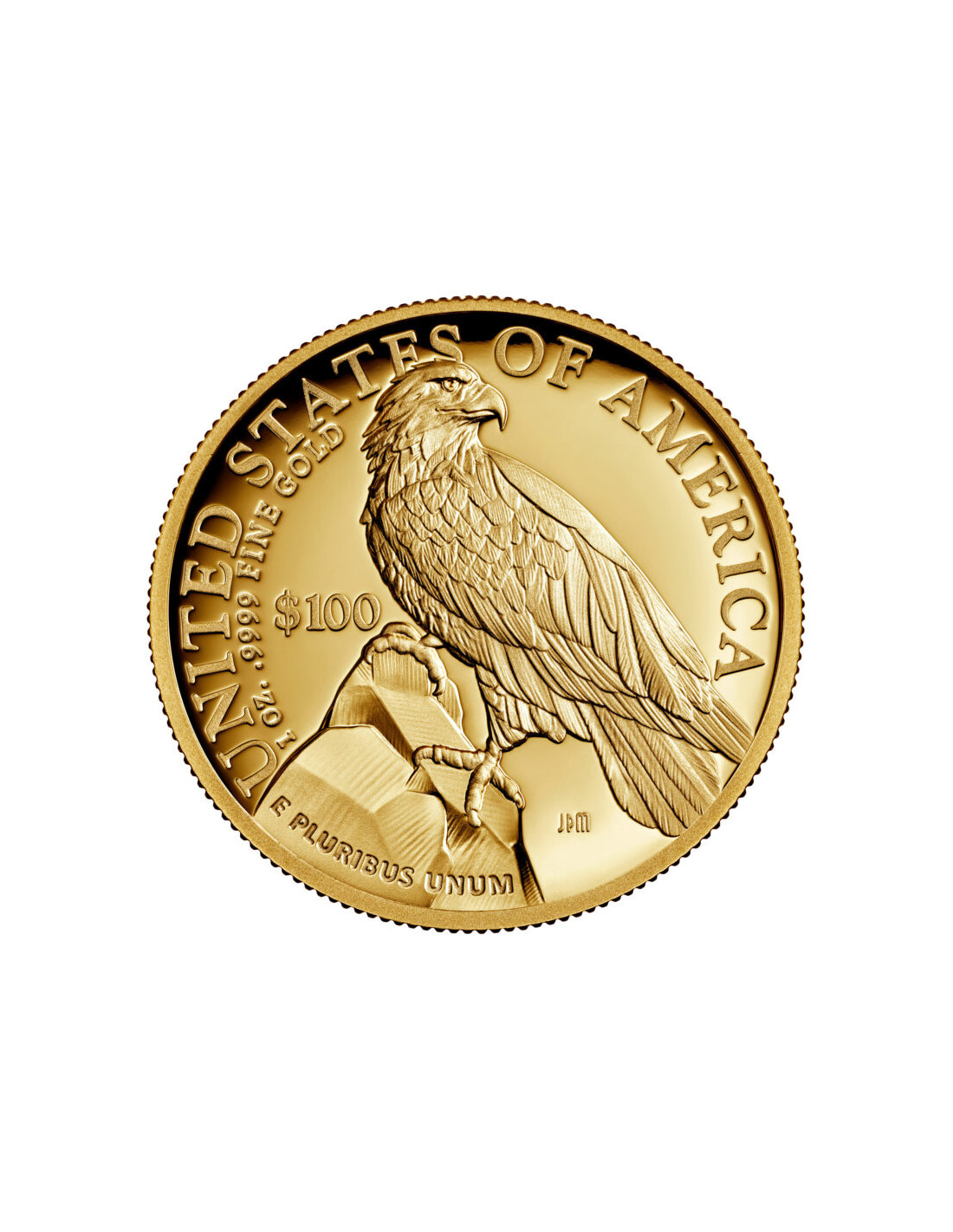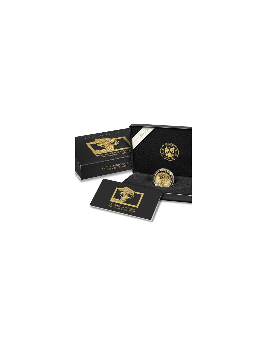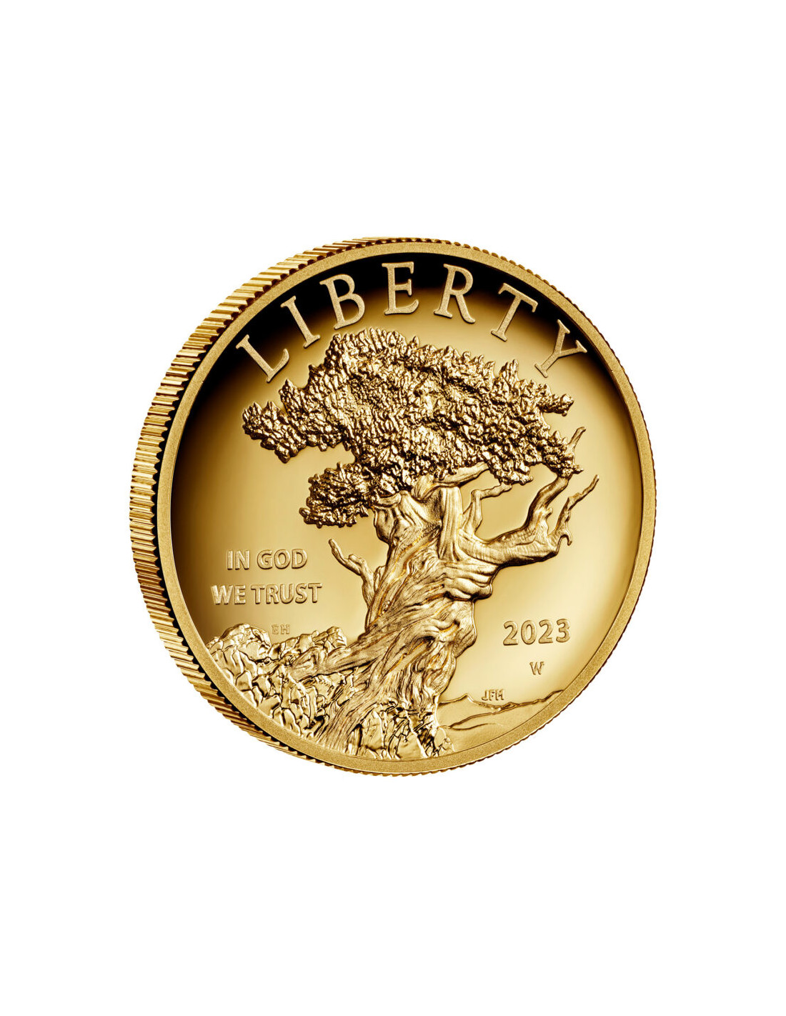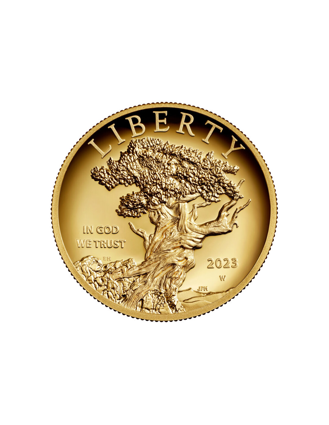 La moneta d'oro American Liberty (High Relief) del 2023 fa parte della serie delle monete American Liberty al suo debutto nel 2015 con il programma American Liberty Gold Coin and Silver Medal. Il disegno sul dritto della moneta American Liberty del 2023 mostra un pino Bristlecone, una specie originaria della California, Nevada e Utah. Si pensa che sia uno degli organismi viventi più antichi sulla Terra, vivendo fino a 5.000 anni. I pini Bristlecone crescono in luoghi dove altre piante non riescono, e sono spesso la specie che per prima ripopola la terra dopo cambiamenti catastrofici.