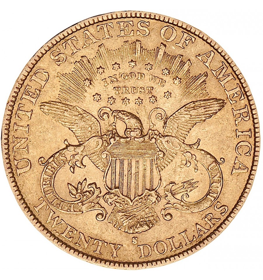 La moneta d’oro americana di maggior valore, approvata dal Congresso degli Stati Uniti con il "Mint Act" del 2 aprile 1792, era quella da 10 Dollari d'oro. Non erano previste monete di valore multiplo viste le difficoltà a trovare oro a sufficienza già per le monete da 2.50, 5 e 10 Dollari, inoltre monete di valore più elevato sarebbero state pressoché inutili nelle transazioni quotidiane di una nazione che stava muovendo i primi passi. Perché le cose cambiassero, si dovette aspettare oltre 50 anni e un sostanziale aumento della disponibilità del metallo prezioso che si verificò con la scoperta dei grandi giacimenti d'oro in California. Il 3 marzo 1849, il Congresso degli Stati Uniti, in ragione dell'aumentata disponibilità di oro, autorizzò l'emissione di monete d'oro da venti Dollari, queste ultime denominate "DOUBLE EAGLES", con un diametro di 34 millimetri e un peso di 516 grani (33,437 grammi), composte per il 90% di oro e il 10% di rame. A realizzarle fu chiamato James Barton Longacre, da cinque anni chief engraver della Zecca degli Stati Uniti, che si ispirò per il dritto alla "Liberty Head" disegnata da Christian Gobrecht per gli altri dollari in oro, mentre per il rovescio realizzò un disegno del tutto nuovo, mai usato altrove nella monetazione americana. Un'aquila ad ali spiegate, con uno scudo quadrato sul petto, che stringe tra gli artigli frecce e un ramo d'ulivo, con ornamenti a destra e sinistra e la scritta "IN GOD WE TRUST". La moneta disegnata da Longacre fu coniata ininterrottamente (con alcune modifiche, riguardanti soprattutto il rovescio) dal 1849 (anno in cui furono realizzati soltanto due esemplari campione) al 1907.